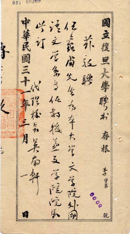 伍蠡甫教授担任出版研究委员会主任委员的聘书 |