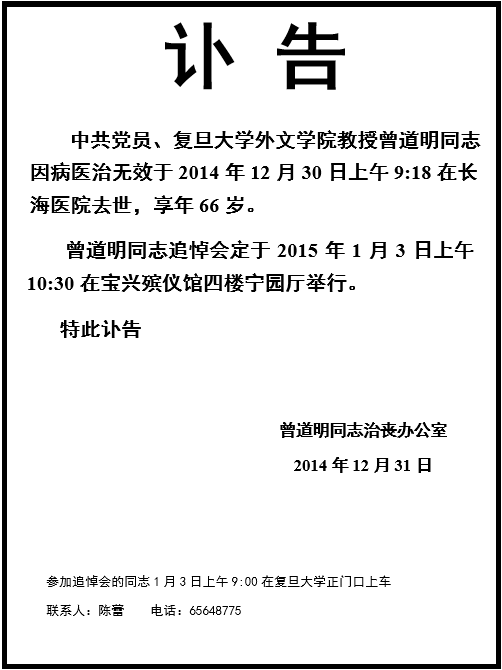 曾道明教授讣告