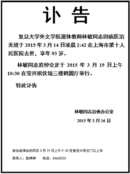 外文学院退休教师林敏同志讣告