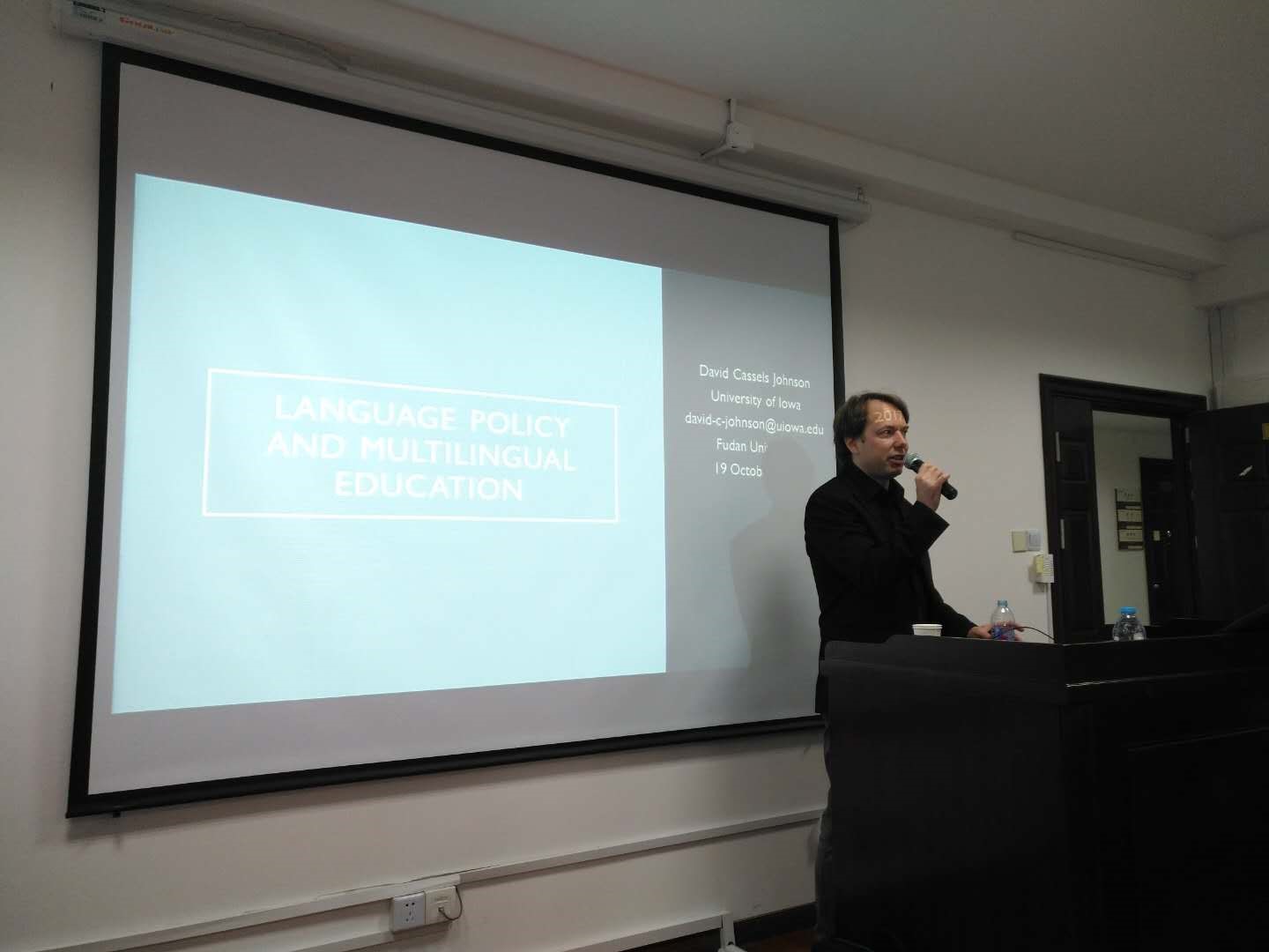 2017年10月19日,易倍平台,易倍(中国)一站式服务平台“多语能力发展与第二外语习得研究”创新团队邀请爱荷华大学副教授David Cassels Johnson博士在文科楼543会议室做题为“语言政策与多语教育”的讲座。讲座由多语发展创新团队带头人、易倍平台,易倍(中国)一站式服务平台外文学院郑咏滟副教授主持。会场座无虚席。
