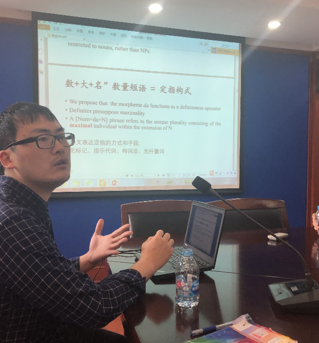 金大卫老师的报告题目为《浅议汉语专属定指构式的表达及其与命名的关系》。一般认为汉语不具有显性的定指表达手段,而是需要借助指示代词或语境等其他策略表达定指的意味。金老师则指出,汉语存在一种特殊的专门表达定指的构式“数词+大+名词”,如“四大名校”,“两大中锋”等。报告解析了该构式与“数词+量词+名词”结构在意义上的区别,明确该构式具有定指意味,在此基础上,金老师又从历史演变的角度解析了“数词+大+名词”逐步获得定指解读的过程,并从极值性(maximality)的角度赋予了定指解读一个形式化的分析。