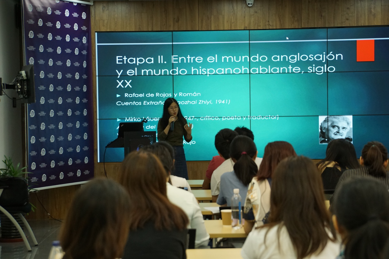 接下来,活动正式进入主题发言环节。首先,Antonio Zapata教授以“华人融入秘鲁社会的道路”为题发表了主题演讲。自19世纪末第一批华人苦力到达秘鲁起,华人群体融入秘鲁社会的尝试经历了由失败到成功的艰辛历程。今天,华人已成为当地各行各业的中坚力量,真正融入了秘鲁社会。随后,Patricia Castro教授讲述了秘鲁的客家人的移民历史。19世纪,中国处于一个混乱的时期,内忧外患此起彼伏。由于太平天国运动的影响,一部分客家人来到了秘鲁。客家人独特的文化特质使得他们在秘鲁创立了最早的华人团体,并在商业领域取得了成功。其后, Rodrigo P. Campos和蔡雅芝分别对土生文学以及明清小说的西语译介进行了介绍。最后,Juan Diego Zamudio介绍了中国在秘鲁的经济影响力。自正式建立外交关系以来,中国与秘鲁在人道主义救援、旅游业、高等教育交流、外交等方面的合作日益紧密。中国对秘鲁的直接投资也逐年增长。与此同时,中国和秘鲁始终保持着良好的贸易关系。现阶段,秘鲁对基础设施建设需求十分强烈,中秘双方应当抓住合作的机遇:推动秘鲁的工业化进程和科技进步,实现合作共赢。