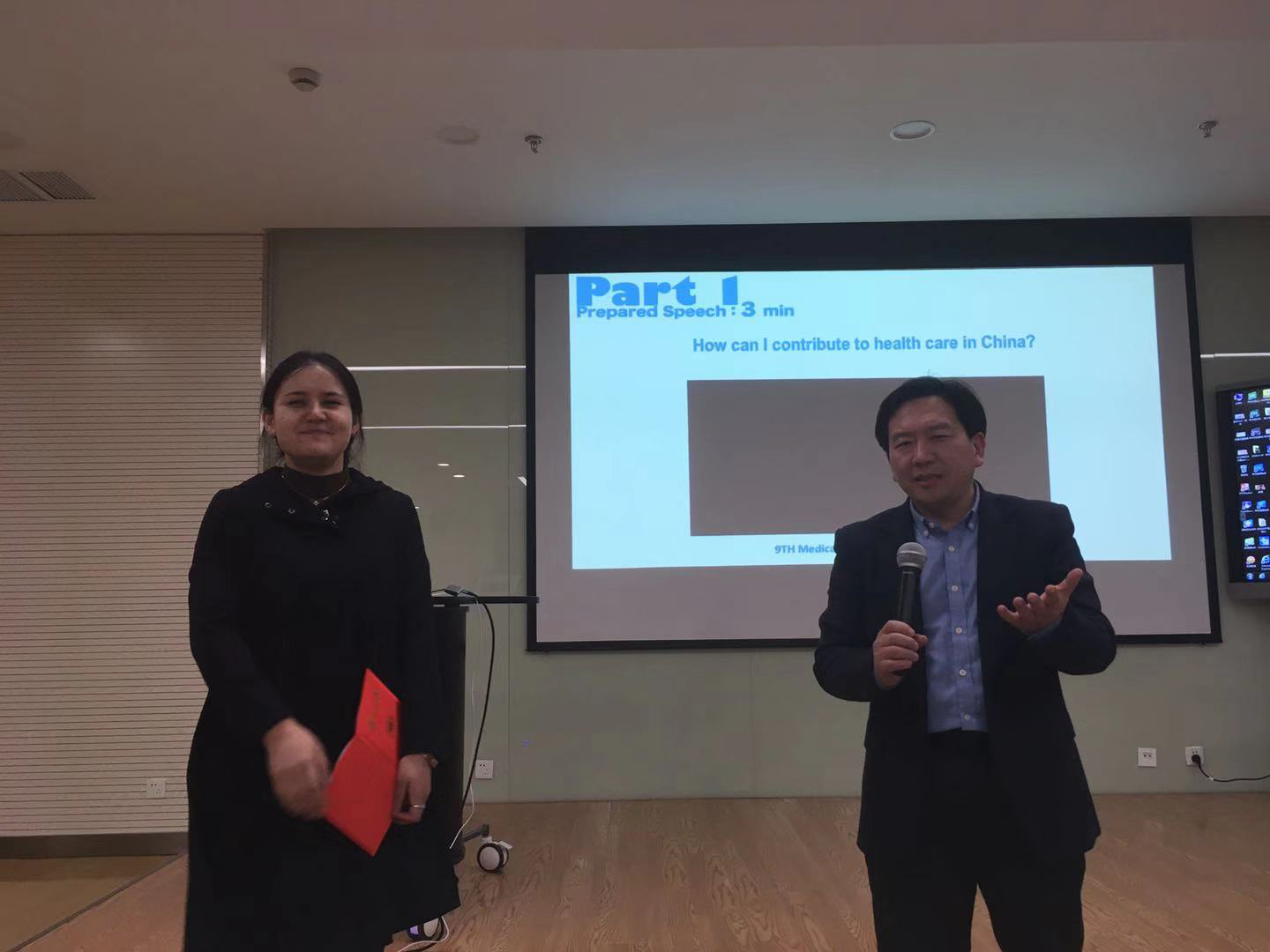 本次比赛以“How can I contribute to health care in China?”为定题演讲的选题,引发学生对自身职业与祖国医疗事业联系的思考,突显思政在医学英语教育中的重要地位。经过紧张激烈的两轮比赛,来自中山医院的博士研究生阿地兰·沙拉木获得比赛一等奖,其他进入决赛的8位同学分别获得二、三等奖与优胜奖。决赛赛后,医学英语教研中心主任孙庆祥老师对比赛做了精彩点评,他指出今年参赛同学从自身出发,话出自己贡献祖国医疗事业的决心,不仅显示了良好的英语口语素养,并且展示了崇高的职业理想。