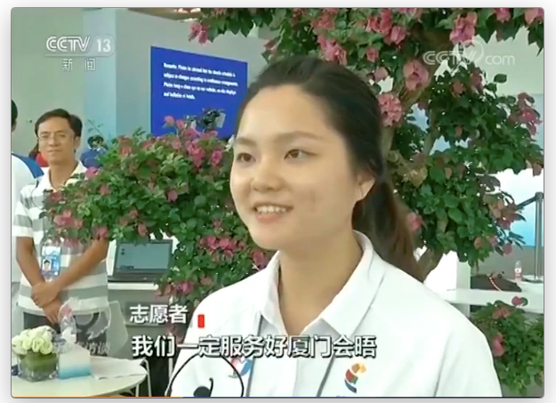 成为一名新闻中心志愿者,我亲身经历了中国继“一带一路”峰会后的又一次主场外交,参与了福建省有史以来最高规格的国际会议。在新闻中心,我第一次零距离地接触了各国媒体,了解了新闻中心的各个功能区划,目睹了各国记者工作尤其是在单边点进行现场直播的场景。与此同时,我也深深地被记者们的敬业精神所打动。许多记者每天5点多就来到场馆开始工作,一直到凌晨才离开。期间若接到采访任务,扛起设备就往外冲,废寝忘食、风雨无阻。当然,这次的志愿服务不仅让我开阔了眼界,更使我对志愿工作有了更深入的认识。起初,我认为志愿者工作无非就是老生常谈的八字箴言——“奉献、友爱、互助、进步”,但这一次,我真正感受到了作为一名志愿者的使命感。这两个月来,我们三次遇到了台风天,但所有人都坚守岗位,不辱使命,就像厦门青年志愿者之歌《阳光里,风雨里》唱的那样,“奉献是我们的宗旨,志愿是我们的名字”。同时,我还体会到了作为一名志愿者的成就感。在服务期间,我几经辗转,帮助一位巴西记者找到了遗失的三脚架,她在兴奋之余多次向我表示感谢,用飞吻表达她内心的感激。像这样的事情在我们工作中并不罕见,但记者们的每一声感谢、每一次点头、每一个微笑都让志愿者们倍感鼓舞。