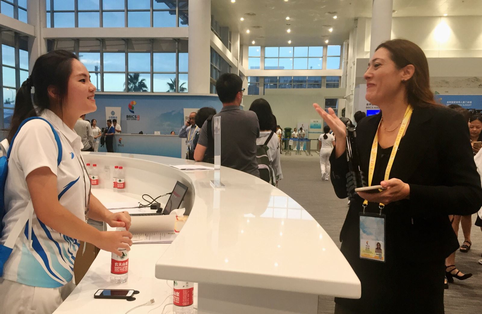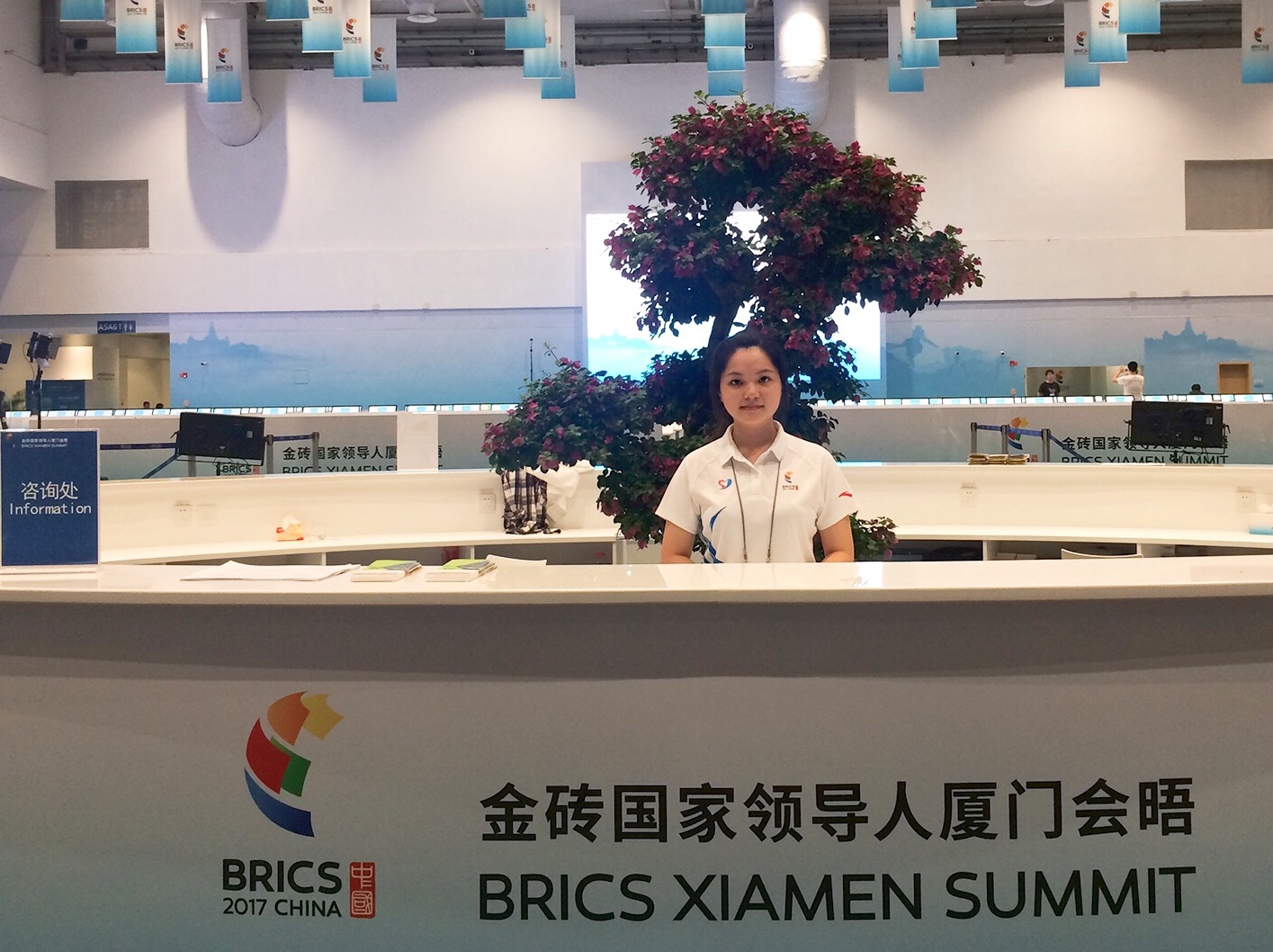 此次厦门会晤期间,我的工作地点是新闻中心的“门面”,即位于入口处的咨询台,主要工作是为全世界的媒体记者提供咨询、引导等服务,为他们答疑释惑。