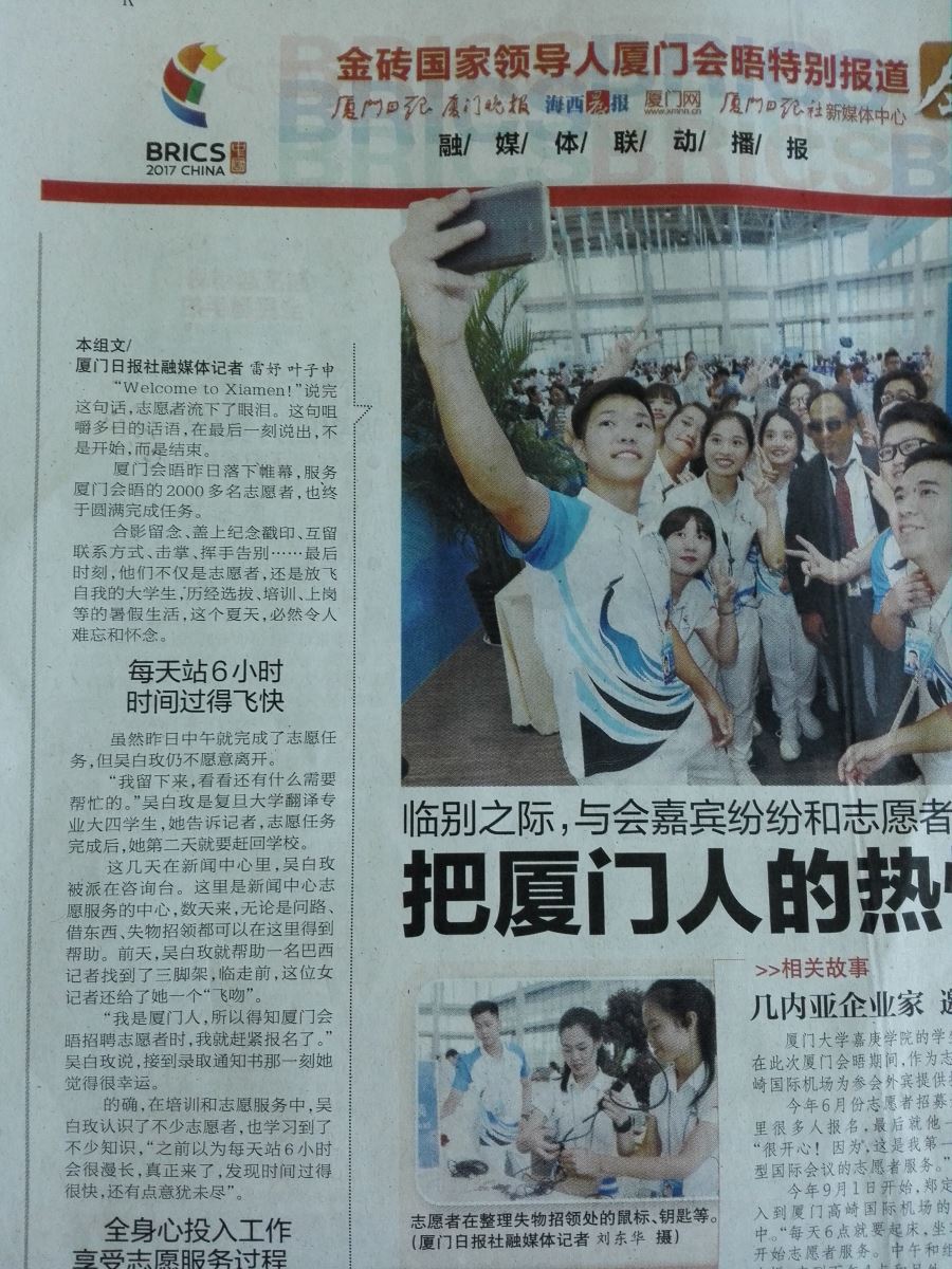 回顾这次厦门会晤志愿者的经历,我的内心充满了不舍与感恩:不舍这两个多月来携手相伴的所有人,感恩这次志愿服务对我的历练与考验。“青春扬帆,助力金砖”!在志愿工作结束之际再次喊出这句口号,内心少了紧张与不安,多了满足与快乐。披星戴月、栉风沐雨的两个多月必会让我历久弥新,而我也想在此刻大声地说出“服务金砖,青春无悔”!