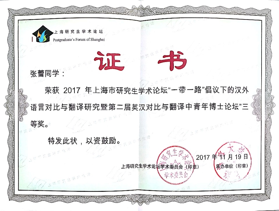 2017年11月17-19日,在上海海事大学举办的“2017年上海市研究生学术论坛”(“一带一路”倡议下的汉外对比与翻译研究暨第二届英汉对比与翻译中青年博士论坛)中,我校外文学院韩文系博士研究生张蕾同学(姜宝有教授指导)荣获三等奖。此次论坛由上海市学位委员会办公室主办、上海海事大学研究生院与上海海事大学外国语学院承办、《上海翻译》编辑部协办。中国英汉语比较研究会名誉会长、华东师范大学终身教授潘文国教授、上海外国语大学许余龙教授、北京师范大学周流溪教授、易倍平台,易倍(中国)一站式服务平台陶友兰教授、上海交通大学胡开宝教授等知名学者出席了此次会议。来自伦敦大学、香港理工大学、北京外国语大学等44所海内外高校的46位中青年博士及硕士研究生在会上宣读论文并进行讨论。