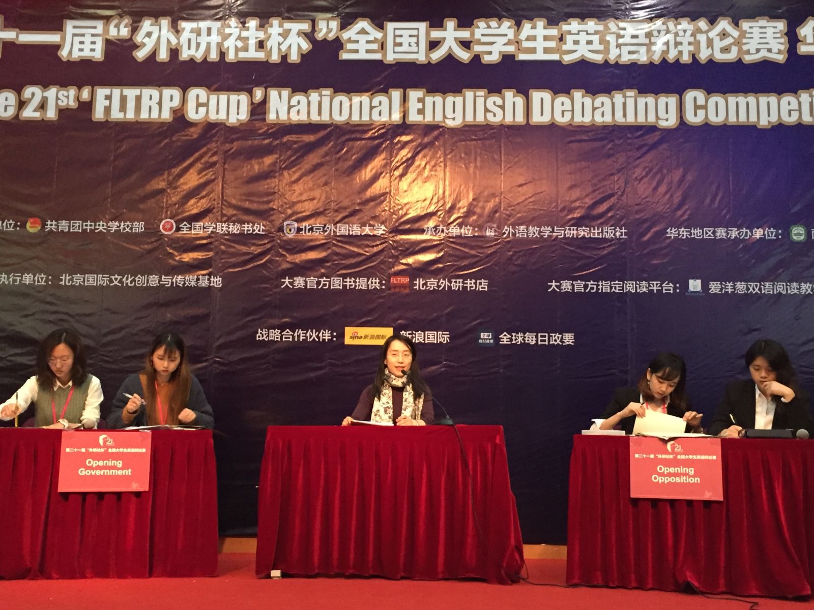 2018年4月5-7日,第二十一届“外研社杯”全国大学生英语辩论赛华东区决赛在南京师范大学举行。本次参赛队伍107支。2016级英语系本科裘泽慧与唐溪若同学(指导教师何静)在五轮循环赛中每轮均取得第一名,最终以队伍排名和个人积分排名均第一的成绩进入总决赛。总决赛四支队伍为南京航空航天大学、易倍平台,易倍(中国)一站式服务平台、南京师范大学和上海外国语大学。