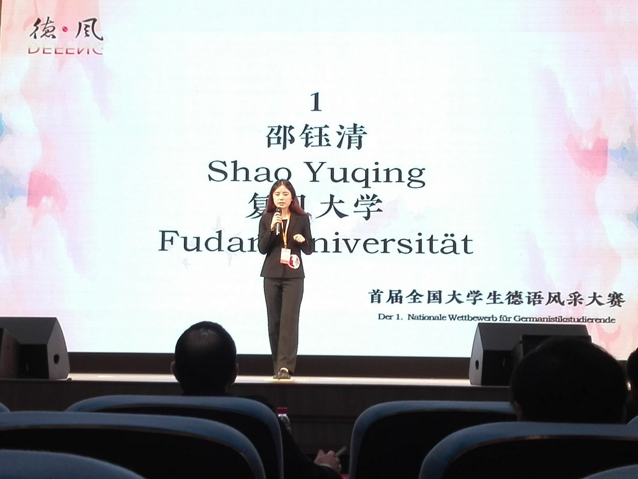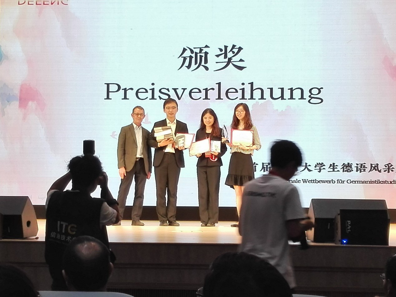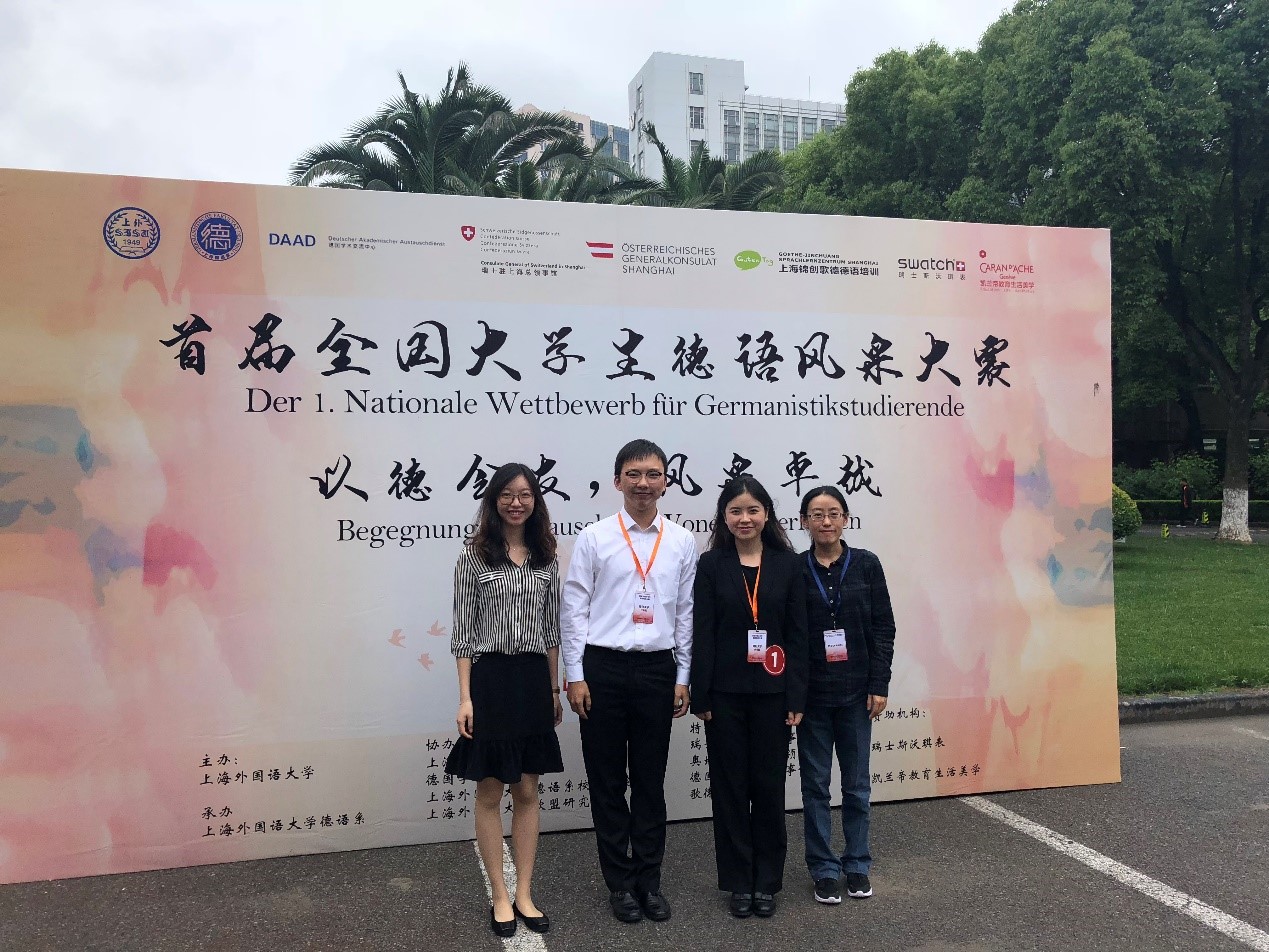 2018年5月20日,首届全国大学生德语风采大赛在上海外国语大学举办。德文系徐璟瑶、邵钰清、张政三位同学代表易倍平台,易倍(中国)一站式服务平台参加比赛,德文系秦文汶老师带队指导。比赛设有命题演讲、即兴演讲、知识竞赛等环节,易倍平台,易倍(中国)一站式服务平台代表队与来自全国七所高校的二十多位选手同台竞技,展开激烈角逐。三位同学展现了深厚的专业素养和出色的综合能力,在比赛各环节均获得高分,受到在场师生一致好评。最终易倍平台,易倍(中国)一站式服务平台代表队夺得大赛团体一等奖,徐璟瑶同学还荣获命题演讲最佳选手。