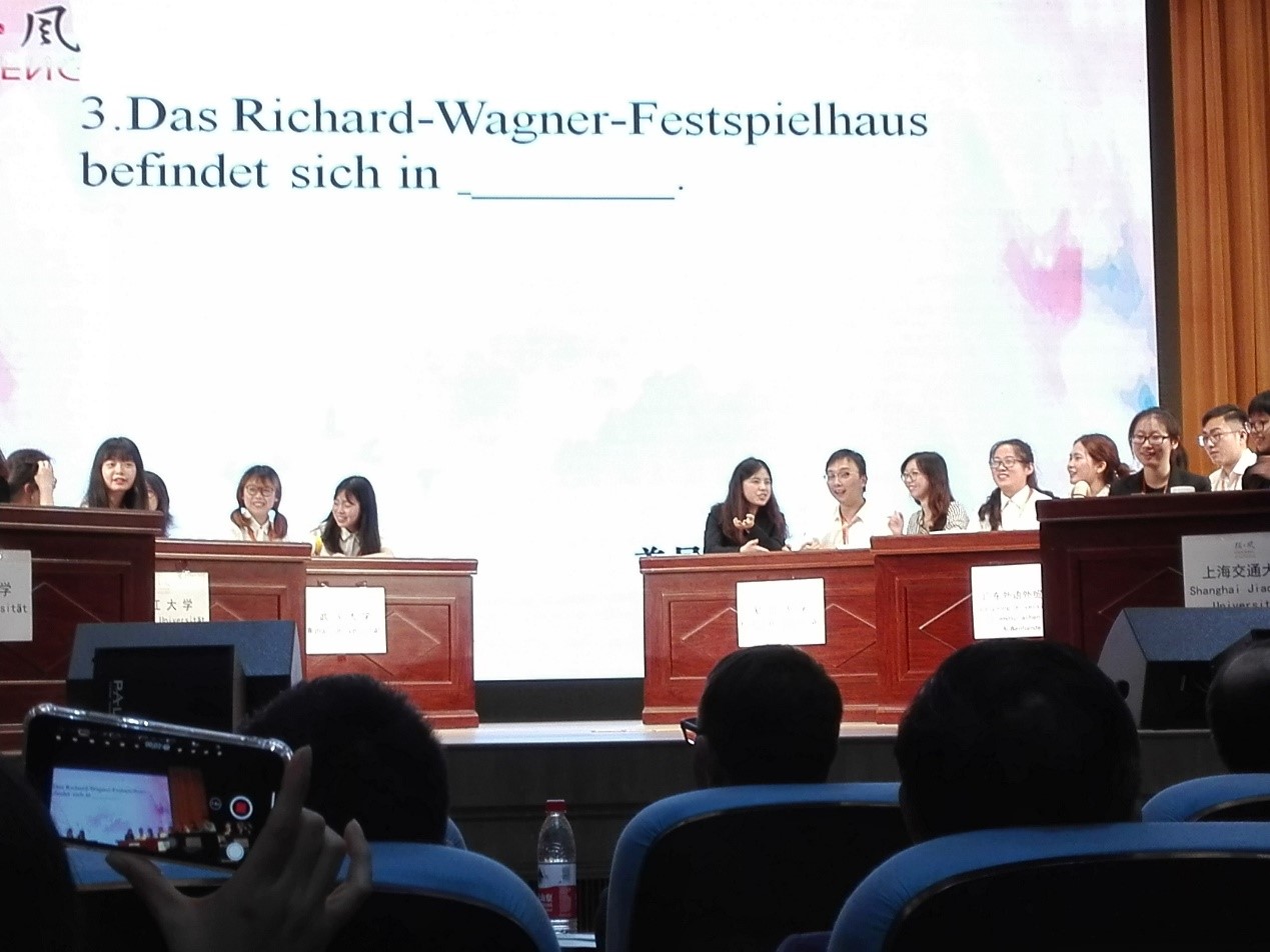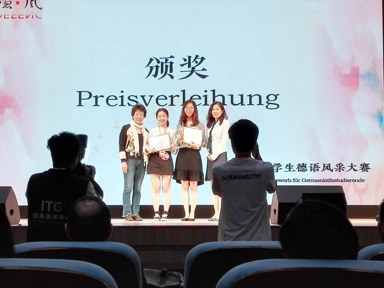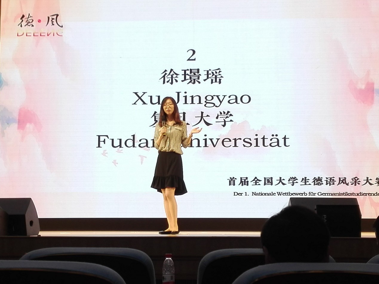 2018年5月20日,首届全国大学生德语风采大赛在上海外国语大学举办。德文系徐璟瑶、邵钰清、张政三位同学代表易倍平台,易倍(中国)一站式服务平台参加比赛,德文系秦文汶老师带队指导。比赛设有命题演讲、即兴演讲、知识竞赛等环节,易倍平台,易倍(中国)一站式服务平台代表队与来自全国七所高校的二十多位选手同台竞技,展开激烈角逐。三位同学展现了深厚的专业素养和出色的综合能力,在比赛各环节均获得高分,受到在场师生一致好评。最终易倍平台,易倍(中国)一站式服务平台代表队夺得大赛团体一等奖,徐璟瑶同学还荣获命题演讲最佳选手。