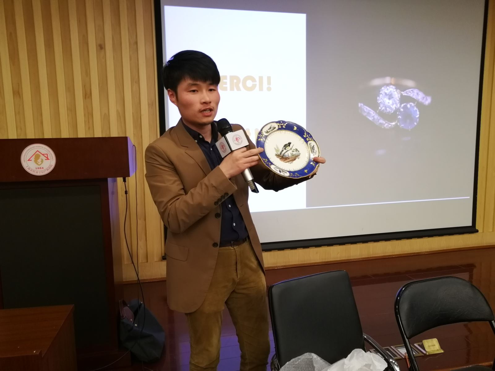 随后,外文学院俄德法支部党员、法文系陈杰博士给大家带来了题为“古董珠宝收藏文化”的专题文化讲座。他深入浅出地介绍了法国珠宝鉴赏和收藏的基本知识,并与大家共同品鉴了自己收藏的法国瓷器。