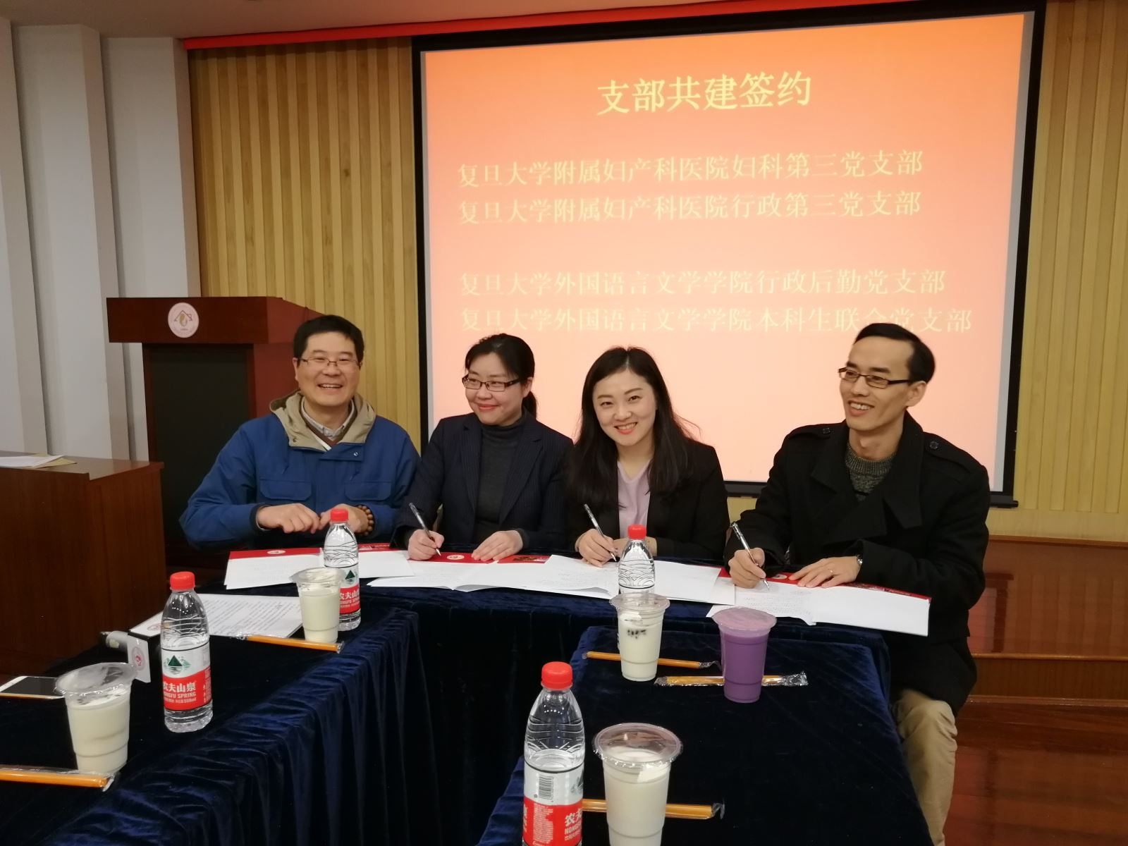 附属妇产科医院妇科第三党支部、行政第三党支部举行支部与外文学院行政后勤党支部、本科生联合党支部签署了共建协议。