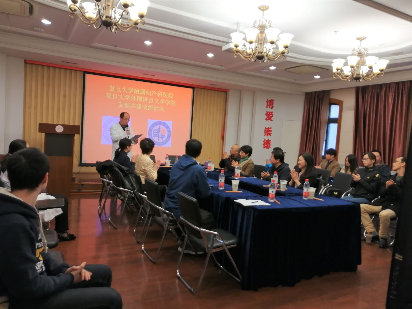2018年11月21日下午,外文学院与附属妇产科医院在附属妇产科医院黄浦院区举行签约共建活动。附属妇产科医院党委书记华克勤、妇科第三党支部书记张英、行政第三党支部书记田复波,外文学院党委书记罗英华、党委副书记曾建彬、赵昕、行政后勤党支部书记鲍伊尹、学生党总支副书记王亚鹏,相关支部党员代表参加了活动。