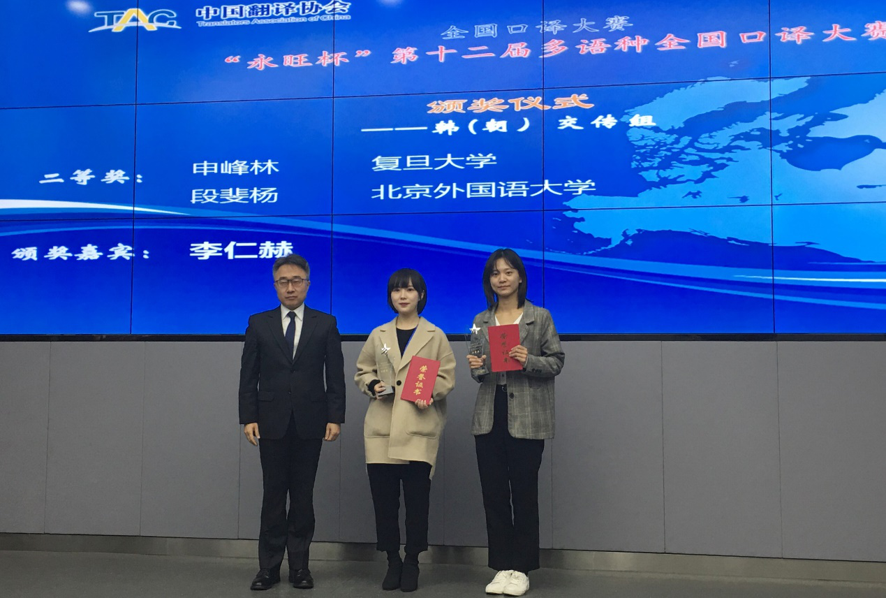 本次比赛分日语组、法语组、俄语组、西班牙语组、阿拉伯语组和韩(朝)语组。其中,来自全国10余所高校的15名韩(朝)语专业选手入围复赛和决赛。我校韩语系博士研究生申峰林同学获韩(朝)语组比赛二等奖,展示了自身优秀的韩国语和汉语水平,也展现了我校外语专业学生的新时代风采。参加本次比赛的指导教师是韩语系黄贤玉老师。