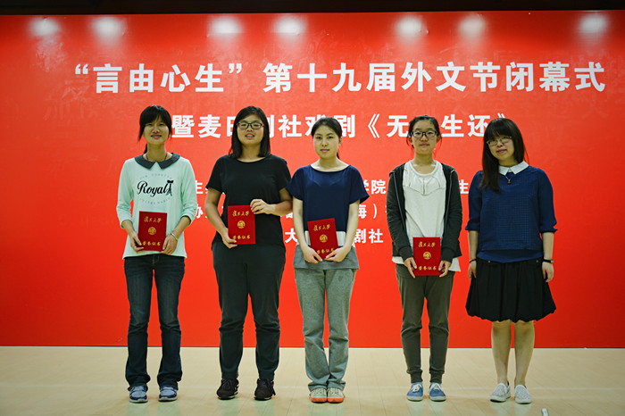 本次外文节闭幕式联合麦田剧社共同举办,前半段为外文节系列活动的回顾以及各项赛事的颁奖仪式,为各位获奖选手送上奖状及祝贺;后半段为麦田剧社年度英文大戏《无人生还》的第一幕演出,吸引众多师生前来观看,谢幕时掌声如雷。至此,“言由心生”第十九届外文节落下了帷幕。