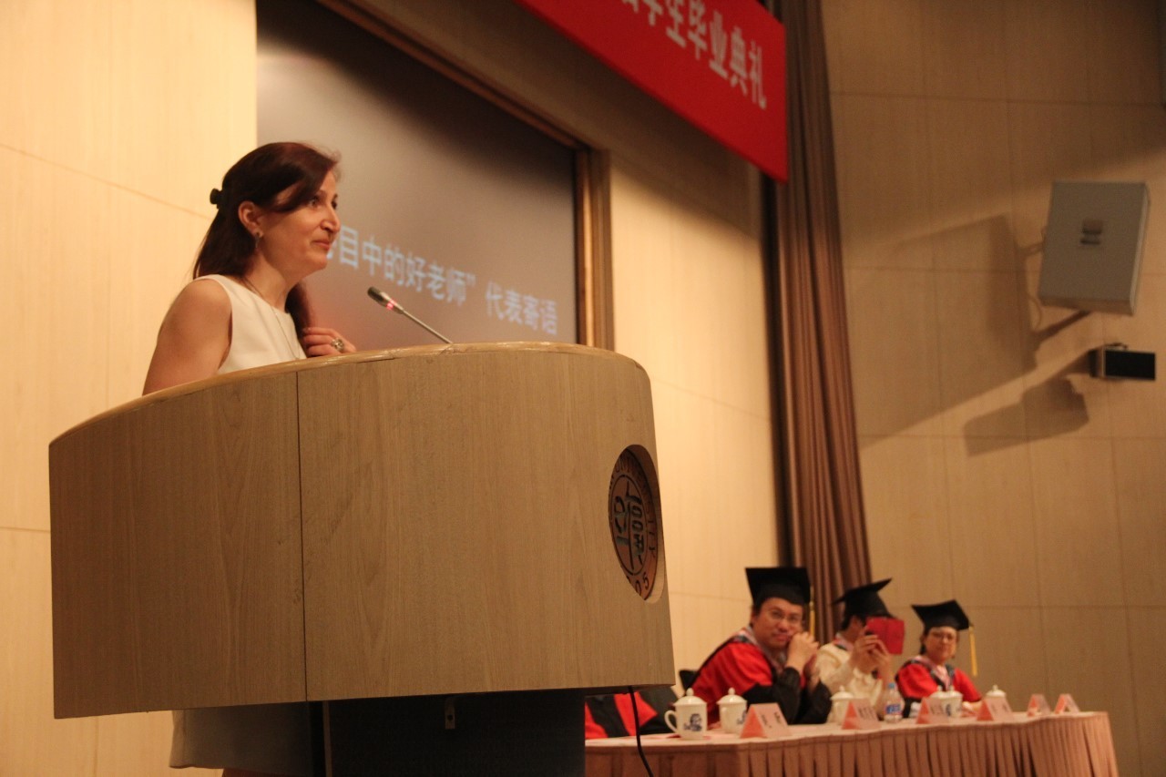 接下来,“好老师”代表、俄语系外教娜塔莉亚?弗拉基米罗夫娜?安德留申科老师和翻译系陶友兰老师先后为毕业生寄语。祝贺全体毕业生顺利完成学业,希望同学们能在未来收获工作和学习中的成功,获得属于人本真的幸福。