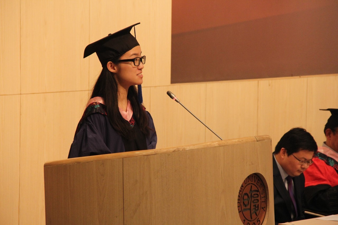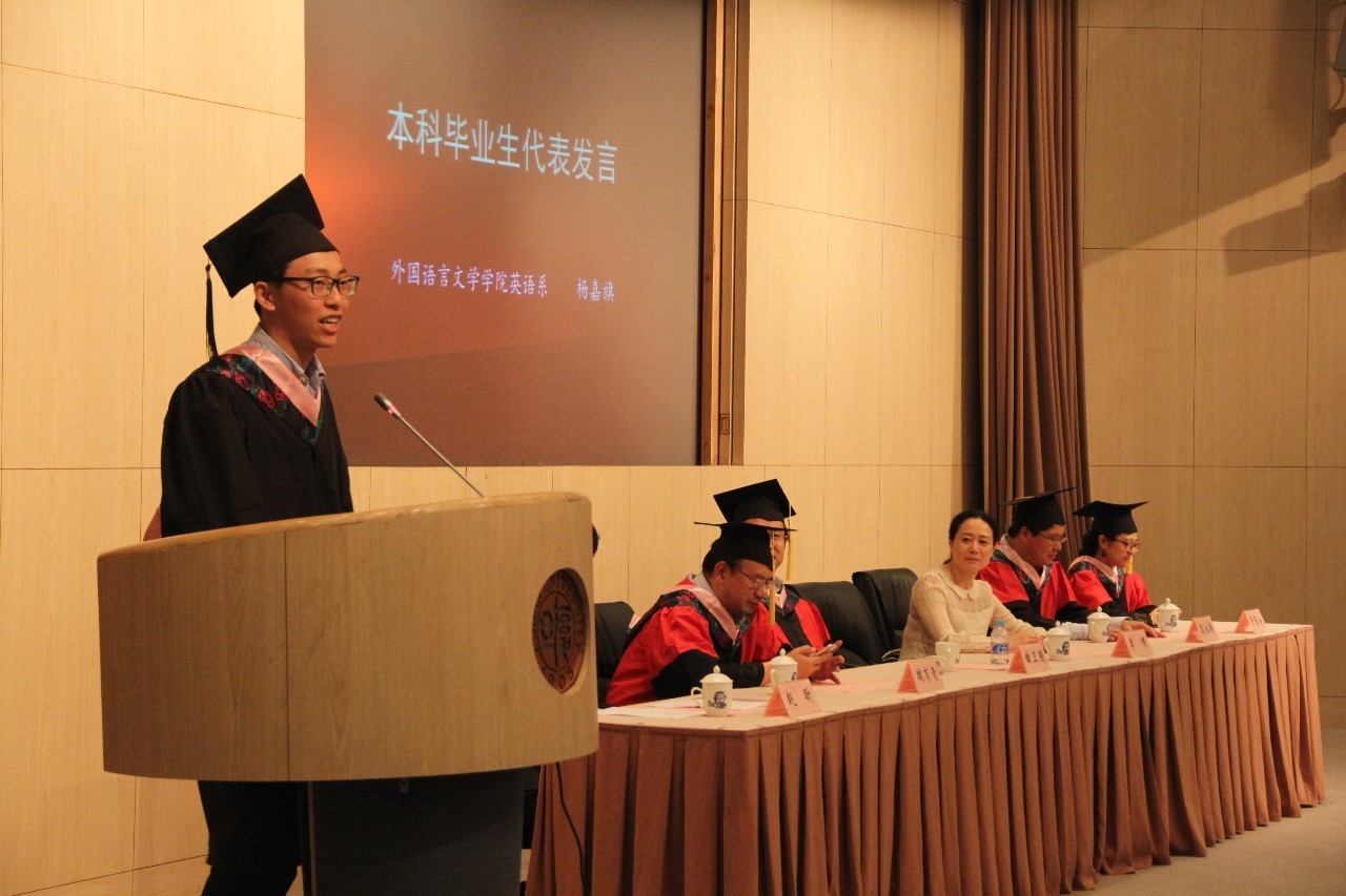 随后,学院党委书记李倩老师宣读学院“上海市优秀毕业生”名单。优秀本科毕业生代表、2016届英语系本科生杨嘉旗,优秀研究生毕业生代表、2016届英语语言文学硕士侯凌玮先后发言。他们表达了对父母和师长的感谢,承诺将带着外院赋予他们的学识和精神,在不同的方向上努力走好属于自己的每一步,以实际行动回报学院、学校、社会和国家的培养。