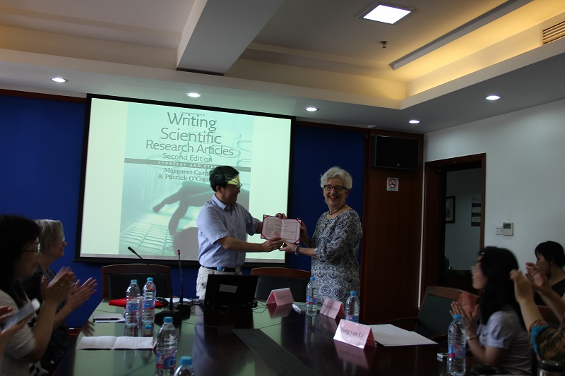 论坛由学会理事、易倍平台,易倍(中国)一站式服务平台外文学院郑咏滟博士主持,会长蔡基刚教授致开幕词。蔡基刚教授首先代表学会向十几年来在中科院、兰州大学、西北农林大学和上海交通大学等地为培训中国科技人员在国际期刊上写作和发表论文的技能方面做出贡献的Cargill博士颁发了荣誉证书,感谢她的不懈的努力和贡献。接着他简述了学会创立国际论文写作与发表中心(Center for Research Writing and Publishing in English)的背景和意图。他认为在国家推进一流大学和一流学科的建设,提出让中国的学术和科研成果走向世界的大背景下,努力提高我国科技人员,高校教师和学生用英语在国际期刊上发表论文的能力显得越发重要。为此他提出成立中心后可以做的三大任务:即1)利用国际专家的资源定期举办各种培训性质的工作坊,尽快提高各学科科技人员和英语教师在国际期刊上交流科研成果,发表论文的技能;2)开发各学科(如医学、生物、化学和农业等)论文写作的语料库,其中包括各学科的论文修辞结构、语步语篇、常用句型和词块等;3)建设在线咨询平台,为各学科的科技人员、高校教师和学生在科研论文写作碰到的问题提供解答和咨询。他认为中心不仅是为科技人员和英语教师服务,更要面向学生,要把学术英语写作纳入到本科大学英语教学中去,培养未来科技人员和技术人员的国际期刊论文写作能力。最后他宣布“国际论文写作与发表中心”的成立,并宣布李咏燕博士担任首届中心主任,Cargill博士为首届中心顾问,并为他们一一颁发了聘书。