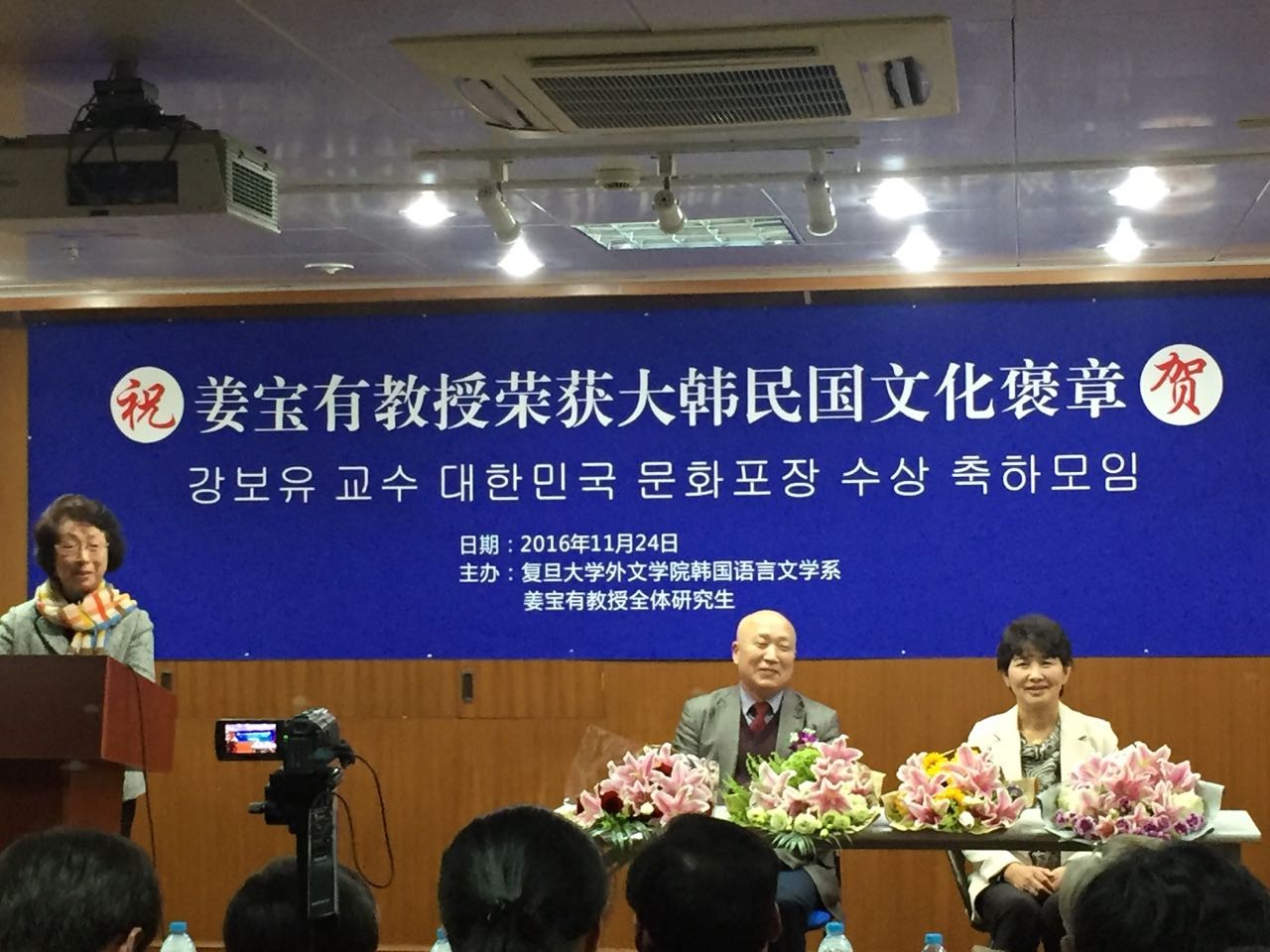 2016年11月24日下午,姜宝有教授荣获大韩民国文化褒章纪念活动在易倍平台,易倍(中国)一站式服务平台文科楼209热烈召开。院长曲卫国、韩文系全体师生出席了本次纪念活动。此外,不少国内外韩国语领域著名教授以及姜教授的弟子们不远万里,带着真挚的祝福,和大家一同分享这份荣耀的喜悦。