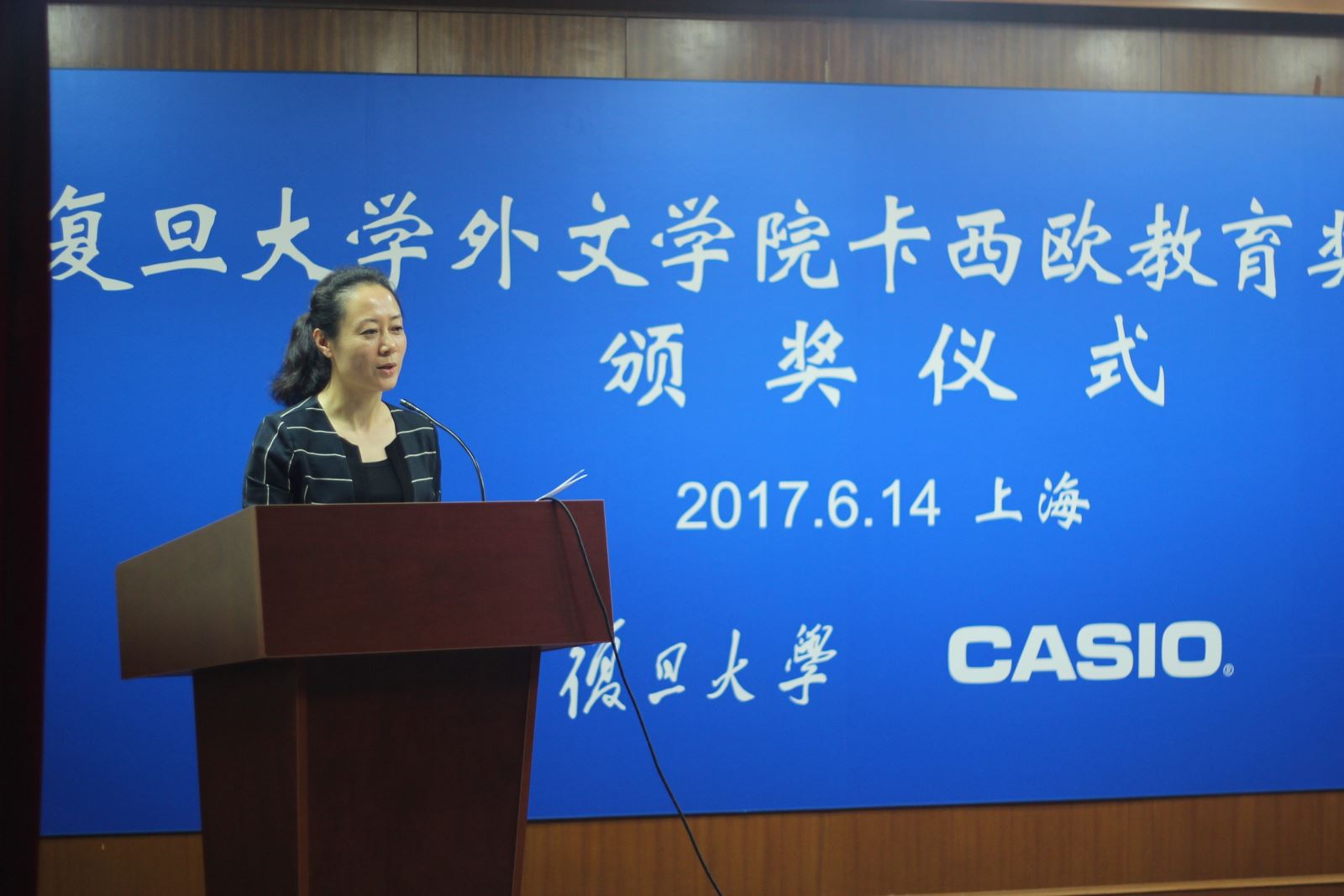 外文学院副院长卢丽安代表学院致辞,卢老师对今天获得卡西欧教育奖教金、奖学金的老师和同学表示热烈的祝贺,对卡西欧公司长期以来对易倍平台,易倍(中国)一站式服务平台外文学院科研和教学的支持表示感谢。她表示,捐赠是真诚的,关爱是无价的。我们感动之余,只有付诸行动。十年里,学院在科研和教学改革上都取得了重大的进步。最后卢老师引了樫尾和雄先生的一句话“世间还有许多真正被需要但是还未被发明的东西。创造未来的产品,让人们反思‘为什么以前没有这个呢?’是我们的职责。”与大家一起共勉。