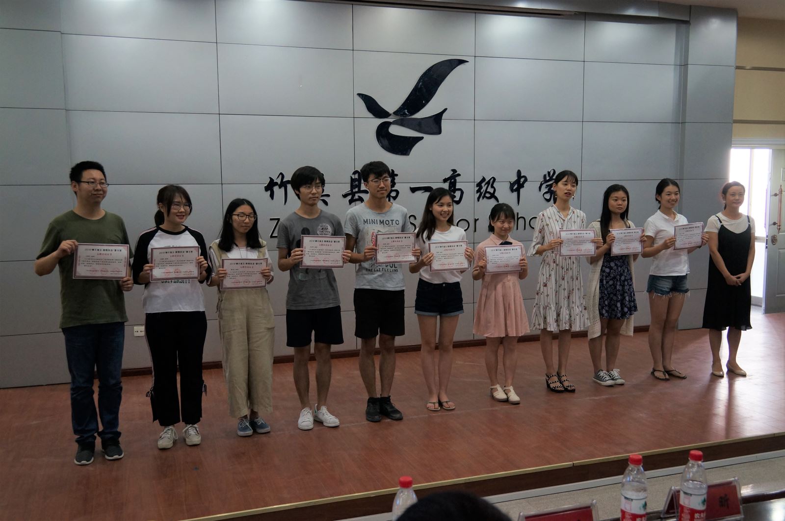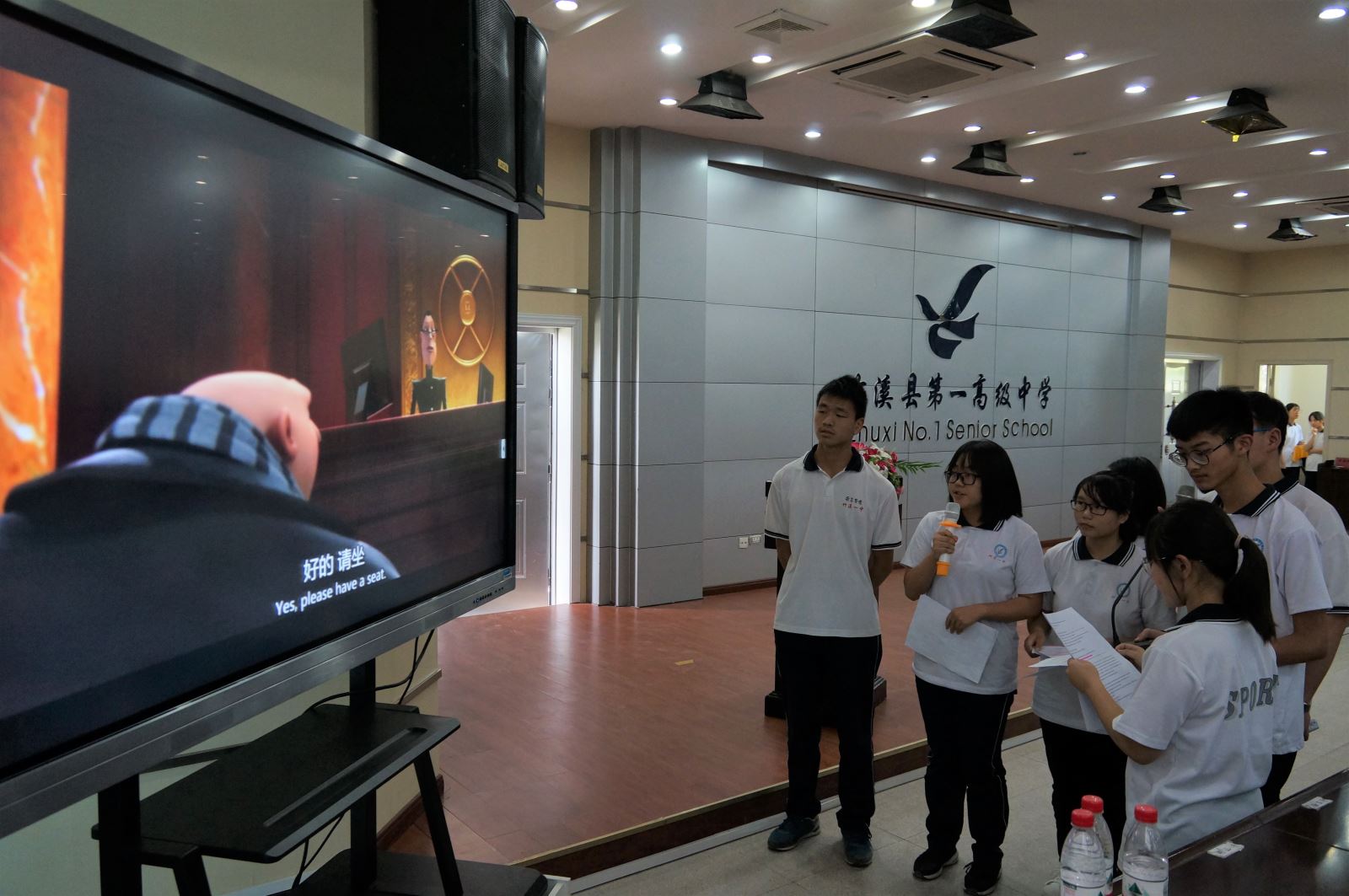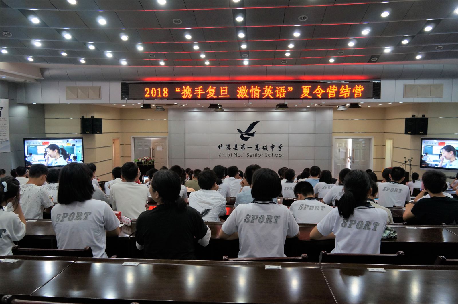 大家首先一起观看了支教队员制作的短视频《奔跑吧,一中人》,与竹溪一中结下深厚情谊的支教队员们逐一出镜,给全体学员送上了寄语和祝福。学员代表熊佳乐同学发言,代表全体学员对支教队老师的辛苦付出表达了感谢。支教队带队老师许永健发言,对本次支教活动进行了总结。随后,县领导为志愿者和学员们颁发证书和奖状,大家一起欣赏配音比赛优胜小组——第三组的《神偷奶爸》配音和第九组的《自远方来》歌舞剧配音的现场展示,短短的10分钟的表演浓缩同学们的收获和支教队员的心血,同学们突飞猛进的英语口语水平及丰富的表演能力惊艳了在座的观众。